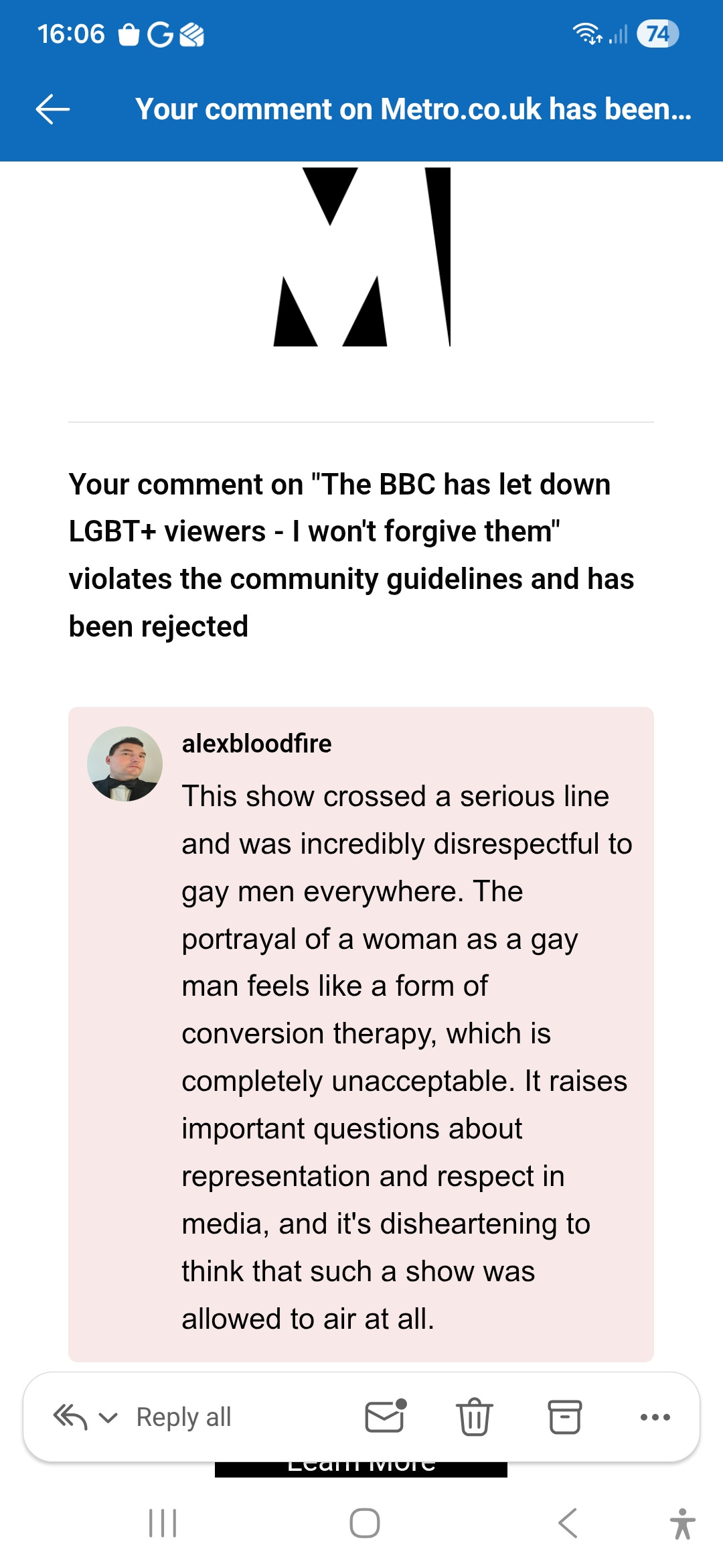 On Thursday, May 12, 2026, I shared my thoughts in response to an article titled “The BBC has let down LGBT+ views – I won’t forgive them.” I believe my contribution was valuable and relevant, and I would like to understand why it was dismissed. Thank you for addressing this matter.